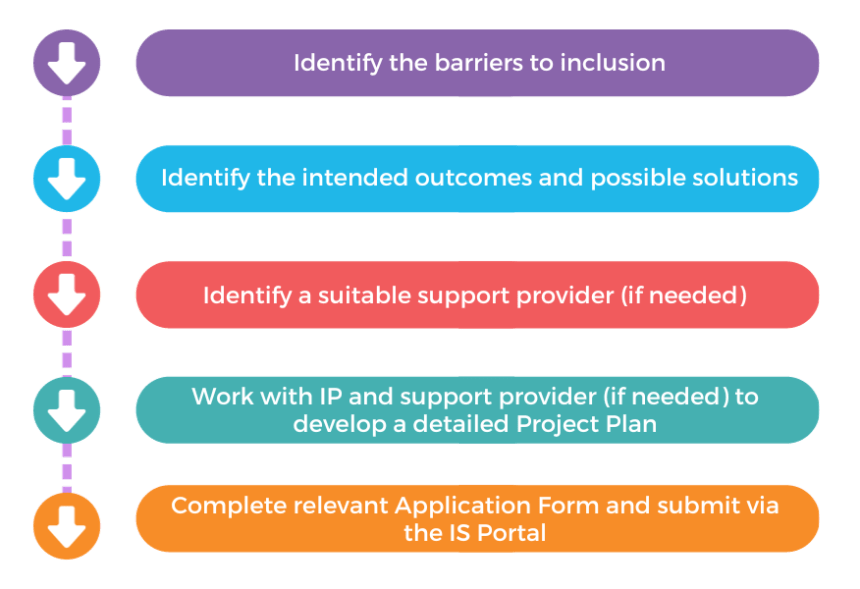 The Project Guide section of this application guide provides further details about the types of projects that can be considered for funding. Services, in collaboration with their IP, should determine the most suitable project type to address their identified barriers to inclusion.